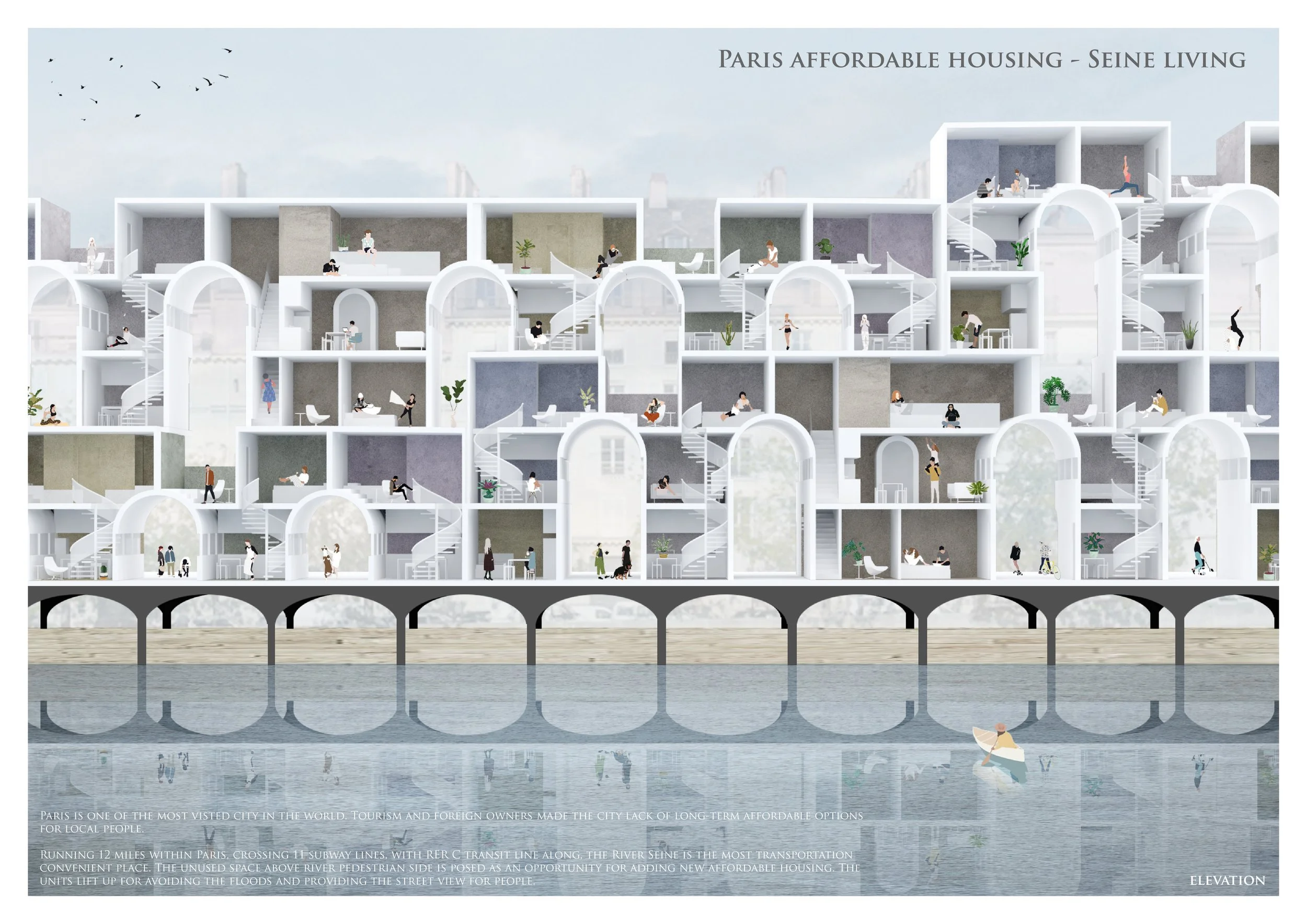 The housing elements are sitting on an elevated platform supported by two row of steel arches. The arches raise the platform up, maintaining the views between the street and the River Seine.